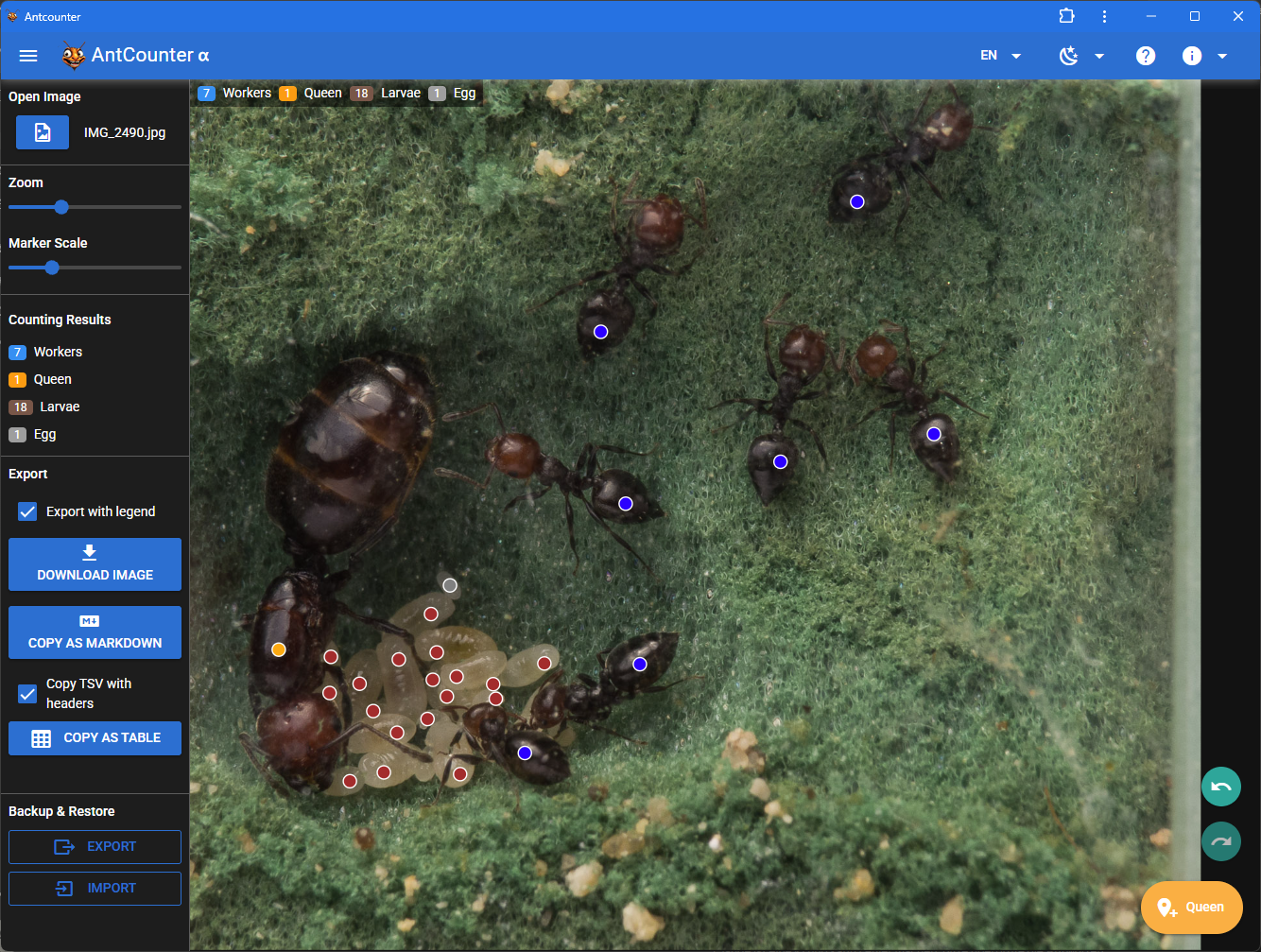 Diese App hilft dabei, Ameisen zu zählen und die Kolonieentwicklung zu protokollieren. Per Klick auf Ameise, Königin, Brut usw. wird das jeweilige Objekt gezählt. Anschließend lässt sich das Bild mit Punkten und Legende exportieren – oder nur die Rohdaten als CSV oder Markdown, z. B. für Excel oder Discord.