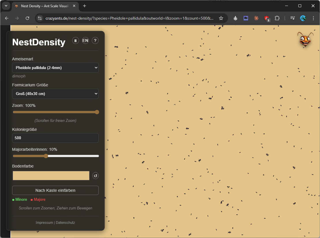 Diese App simuliert Koloniegrößen – praktisch, wenn man sich z. B. vorstellen möchte, wie 500 Pheidole pallidula in einer 20×10 cm großen Arena (Outworld) aussehen. So lässt sich abschätzen, wann ein Arenaupgrade sinnvoll wird oder ob eine bestimmte Größe bis zur maximalen Koloniegröße ausreicht.