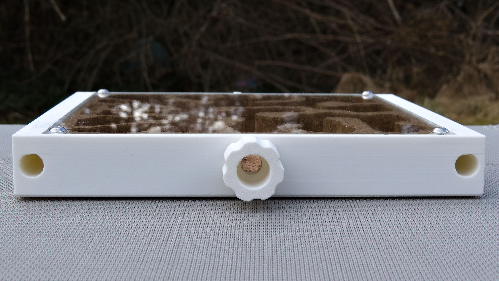 Die Scheibe sitzt perfekt auf dem Nest und mir sind keinerlei Ameisen ausgebrochen. Auch der Korkeinsatz sitzt perfekt und ist sehr sorgfältig gefräst worden. Zur Befestigung werden außerdem Schrauben verwendet, die auch nach vielen Monaten die Scheibe noch sicher ans Nest drücken werden. Diese Art der Befestigung ist übrigens viel besser als die 3D-gedruckten Befestigungsmechanismen, die manche Hersteller verwenden. Diese können mit der Zeit ausleiern und die Scheibe nicht mehr gut am Nest halten. Das kann dann sogar zu einem Ausbruch führen (und das passierte auch bereits…).