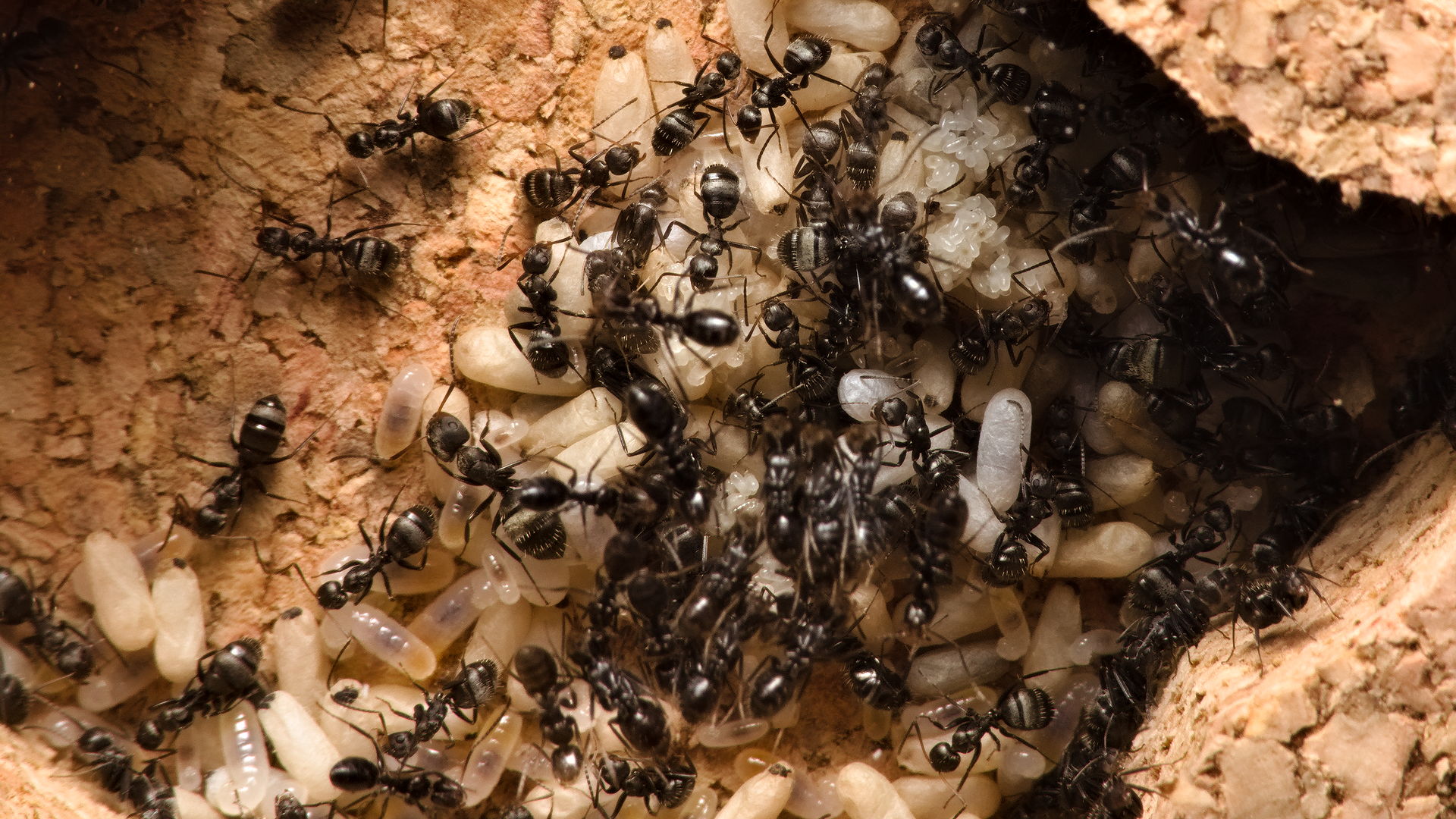 In der Nahansicht sieht man gut, dass Brut in allen Stadien gelagert wird. Sogar Eier und kleine Larven sind in dem völlig trockenen Nest vorhanden. Das zeigt, dass diese Art gut ohne eine extra Nestbefeuchtung klarkommt.